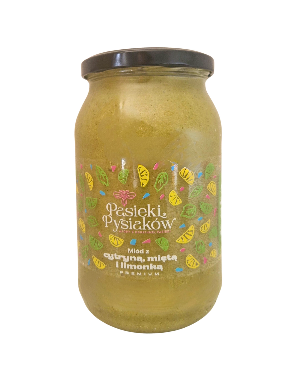 - Naturalny miód wielokwiatowy połączony z cytryną, miętą i limonką liofilizowaną w słoiku o pojemności 1200g. 100% produkt polski