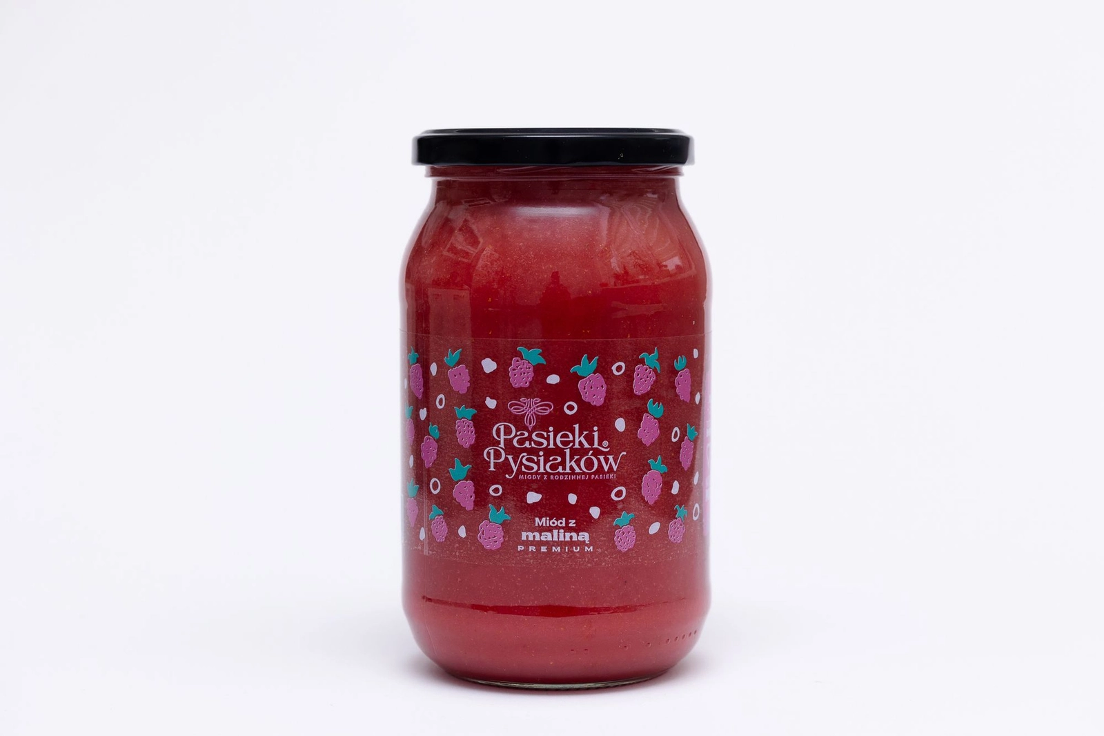- Naturalny miód wielokwiatowy połączony z malinami liofilizowanymi w słoiku o pojemności 1200g. 100% Polska produkcja z własnej pasieki.