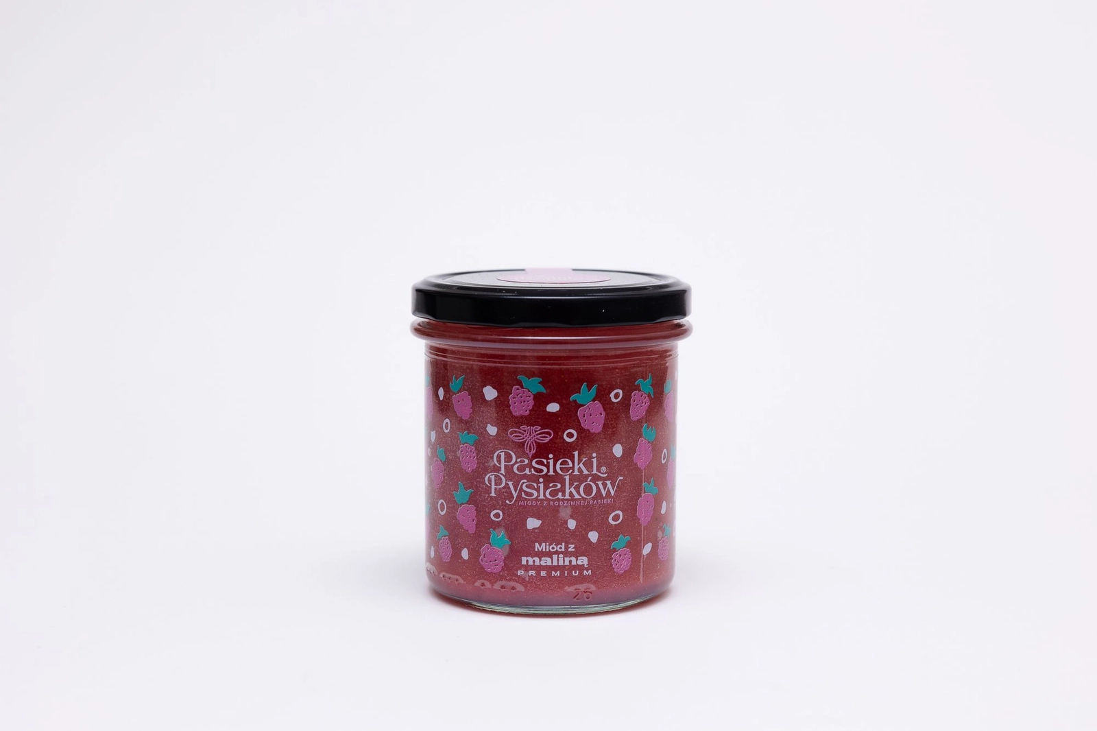 - Naturalny miód wielokwiatowy połączony z malinami liofilizowanymi w słoiku o pojemności 200g. 100% Polska produkcja z własnej pasieki.