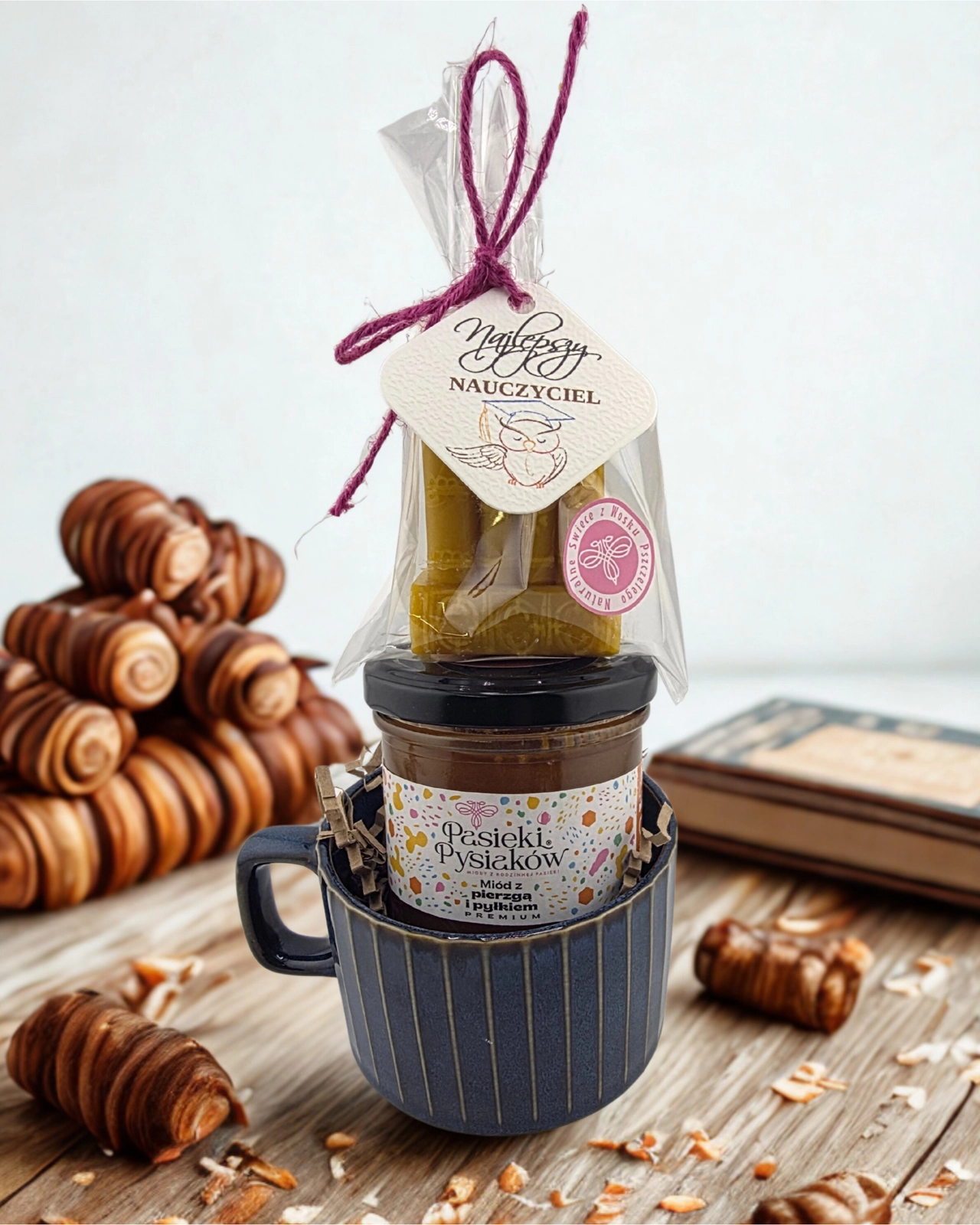 Prezent na Dzień Nauczyciela. Zestaw prezentowy małego miodu z kubkiem i łyżeczką oraz świecą z prawdziwego wosku pszczelego