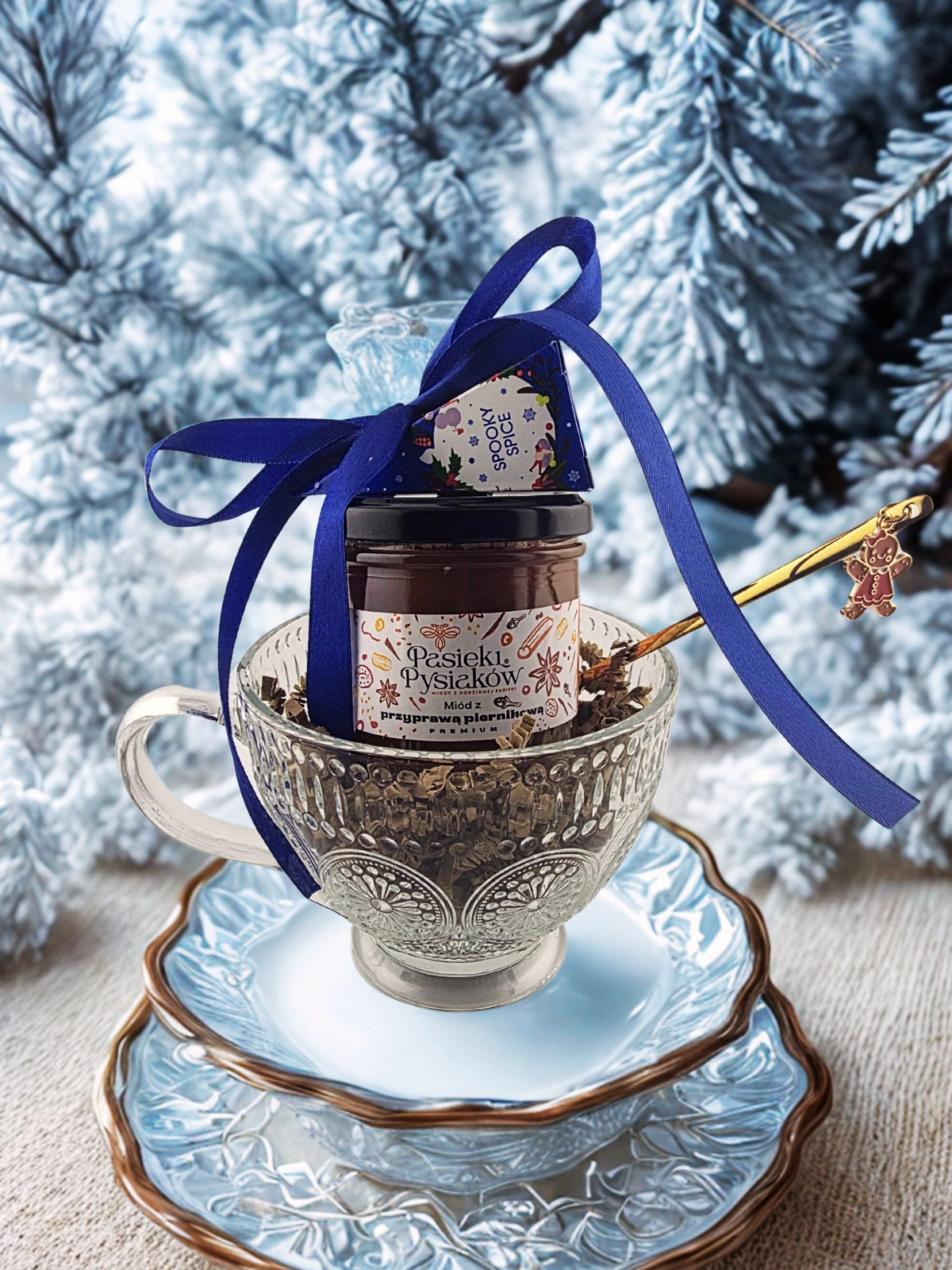 Prezent pod Choinkę. Zestaw prezentowy miodu z kubkiem , herbatką i łyżeczką piernikową