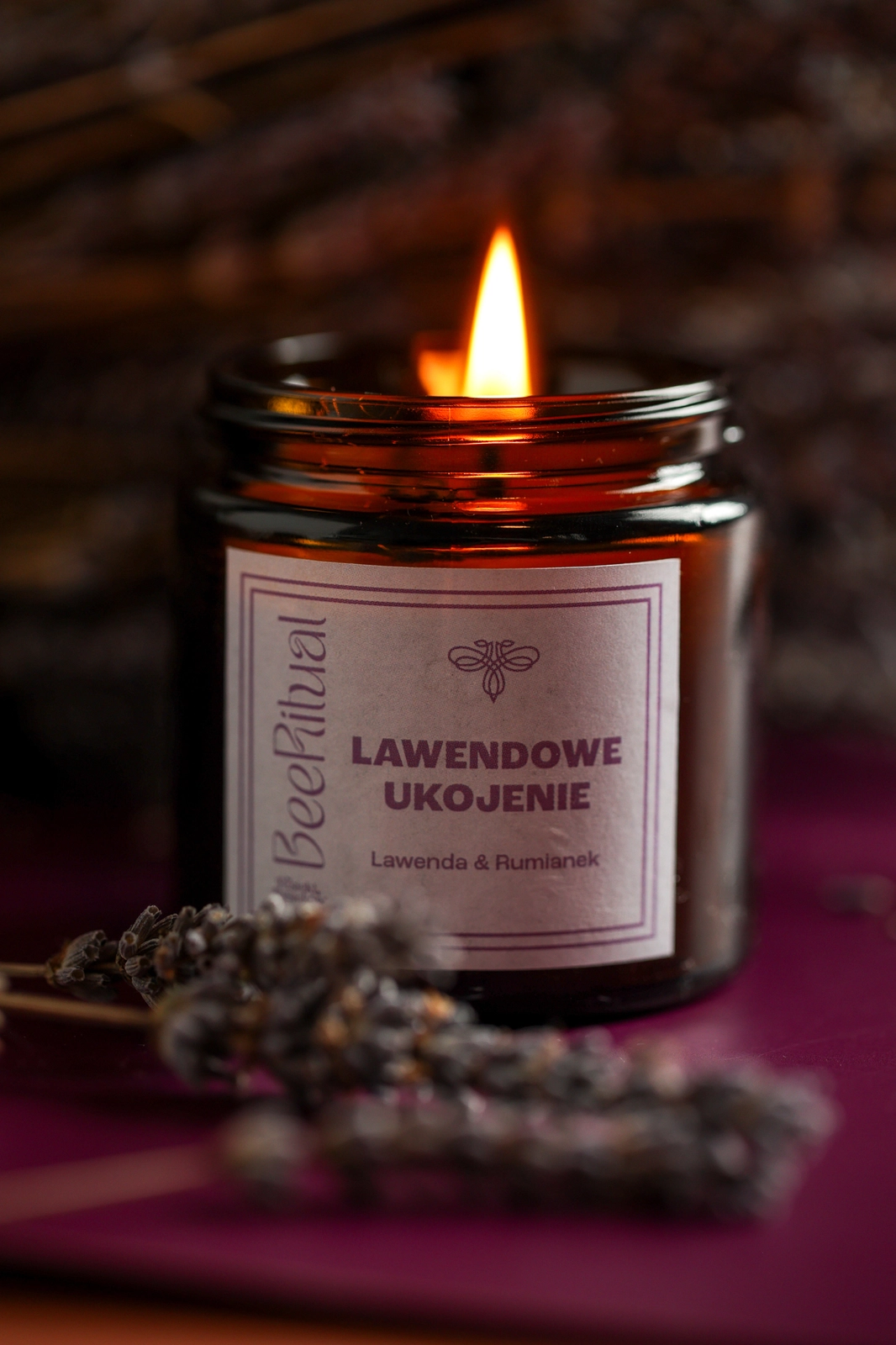 ,,Lawendowe ukojenie" to połączeniu wosku pszczelego z suszonymi kwiatami lawendy i rumianku, które wprowadzą Cię w stan relaksu i ukojenia. Idealna do chwil wyciszenia i odpoczynku.