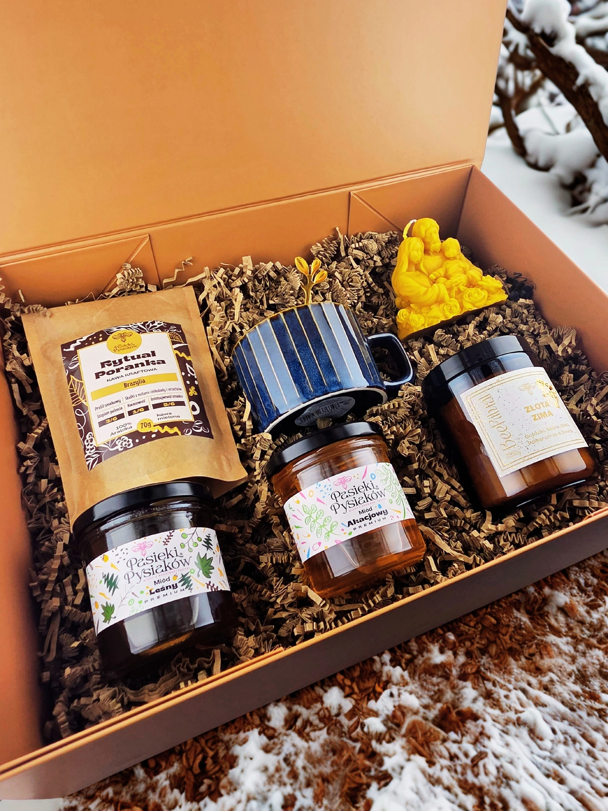 - Miód/Produkt Pszczeli 2 słoiczki do wyboru , duża Miodowa Świec w słoiku z serii BeeRitual, Świeca z oryginalnej formy do wyboru, Eleganckie filiżanki wraz ze złotą łyżeczką, Kraftowa kawa.