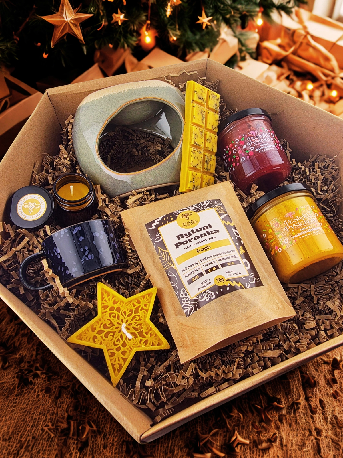 - Miód/Produkt Pszczeli, Świeca z oryginalnej formy do wyboru, Elegancka filiżanka, Kawa kraftowa, Zestaw do Aromaterapii.