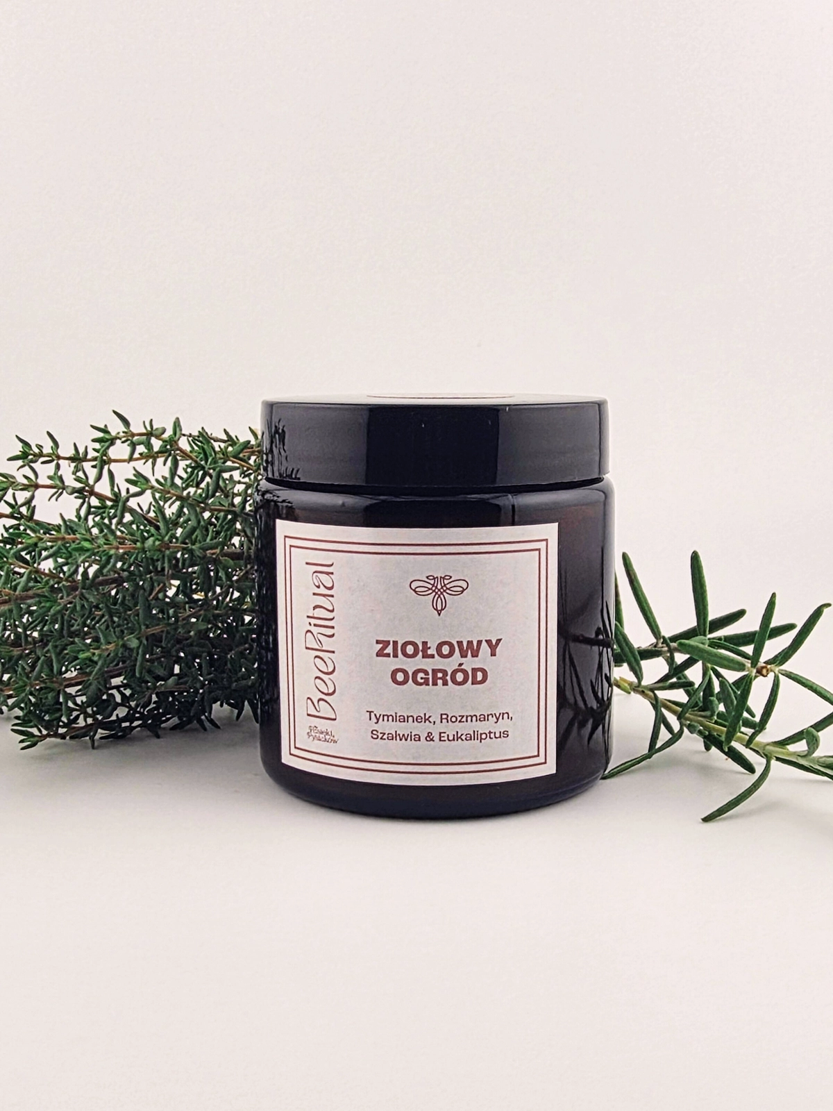 Skład: Wosk pszczeli, suszone zioła (tymianek, rozmaryn, szałwia), olejki eteryczne- rozmarynowy, eukaliptusowy, bawełniany knot